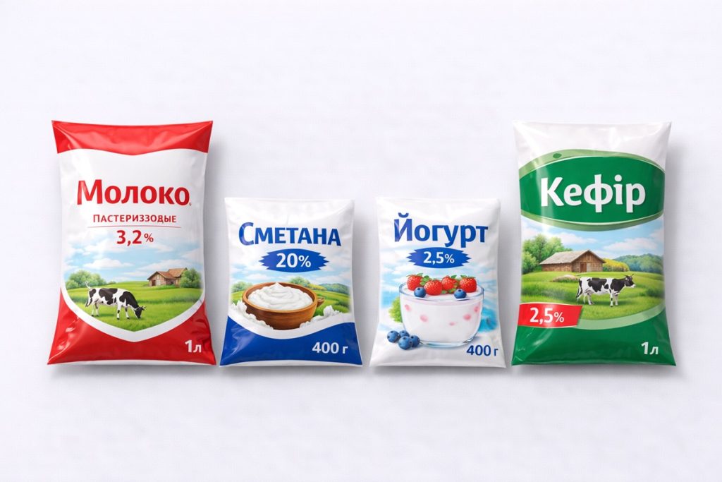 • Пакування молока, кефіру, ряжанки — у форматі “пакет-подушка”.